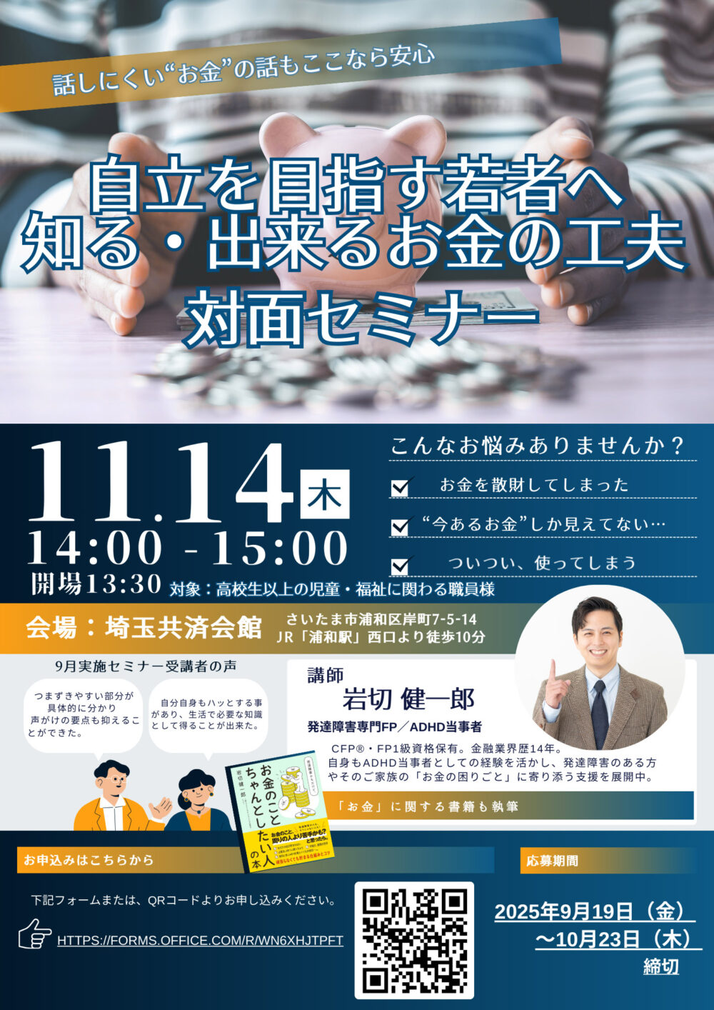 NPO法人コンパスナビ様にて講演させていただきました 2025.11.14 お知らせ 11月14日、NPO法人コンパスナビ様にて「発達障害とお金」というテーマで講演させて頂きました。 15名近くの方にご参加頂きました。 アンケートでは全員の方に「大変参考になった」とご記入いただきました。 ありがとうござました!